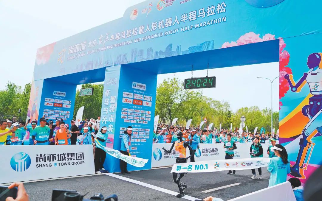 4 月 19 日,2025 北京亦庄半程马拉松暨人形机器人半程马拉松赛,“天工 Ultra”机器人冲刺夺冠。这是人形机器人首次在开放环境下进行长距离耐力测试。经济日报记者翟天雪摄
