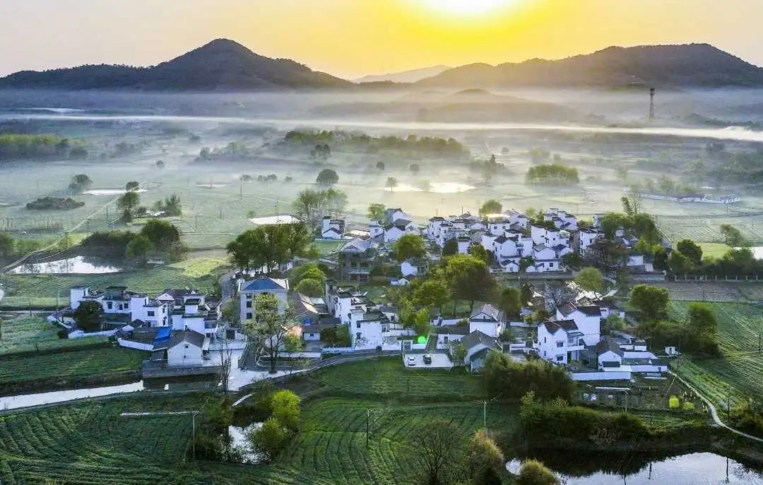 4 月 8 日,安徽省芜湖市孙村镇水口村,清晨薄雾环绕,青山如黛,民居错落有致。邢朝明摄(中经视觉)
