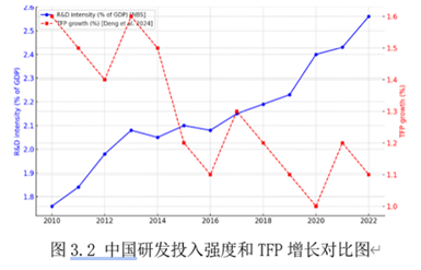 习近平总书记指出,发展新质生产力要以全要素生产率的大幅提升为核心标志。从图表数据可见,我国研发投入强度(蓝线)近年来持续增长,2024 年已达 2.68%,但全要素生产率(TFP)增长率(红线)却呈下降趋势,近年已降至 2% 以下。这一“投入增长、效率放缓”的反差表明,我国亟需建立以全要素生产率为核心导向的科研绩效评价机制,通过构建创新生态、加速科技成果扩散、重构制度体系与激励机制,倒逼科研效率提升。