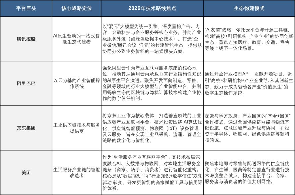 当产业互联网的重构奠定了“开放、网状、智能协同”的新基座,核心逻辑已从泛化的“赋能”转向聚焦的“价值原生”,AI 与科学技术(AI+ST)的深度融合成为驱动产业价值网络重构的“必要模式”。国内领先的互联网平台正凭借其积累的技术、数据与生态优势,沿着差异化的路径,布局未来增长的确定性赛道。从通用平台到垂直深水区,各大平台依据自身核心能力与资源禀赋,选择了不同的产业互联网切入深度与主攻方向。[1]