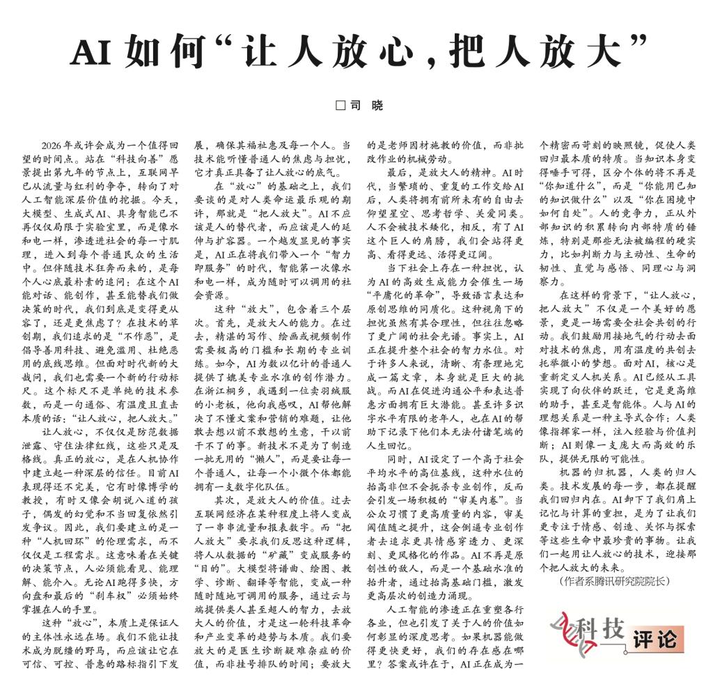 近日,腾讯集团副总裁、腾讯研究院院长司晓在《学习时报》发表文章《AI如何“让人放心,把人放大”》,现原文转发,以飨读者。