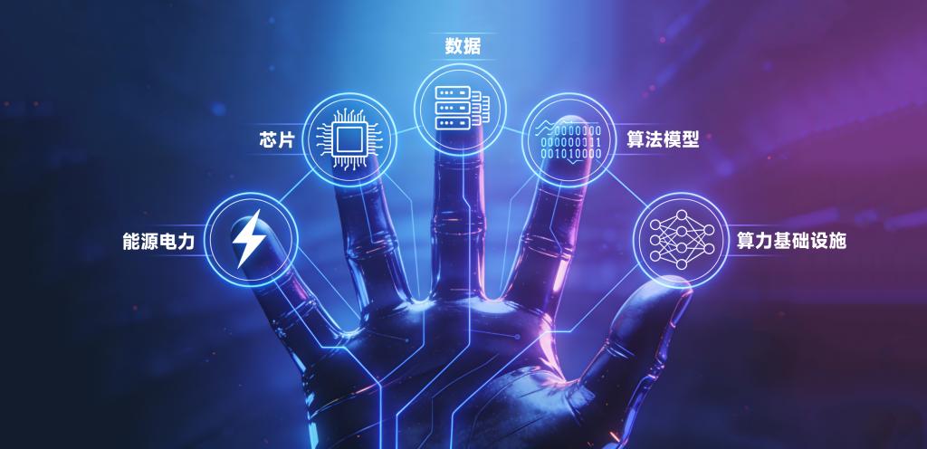 在全球新一轮科技革命的浪潮中,人工智能已逐渐演变为重塑文明形态的核心驱动力。当各界热议人工智能如何赋能产业、重构社会时,一个同等重要的问题值得深入探讨:人工智能自身是如何构成的?支撑其持续进化的内在技术体系由哪些层次组成? 这两个问题,恰如一只手的手心与手背。在《数字化平台与产业融合的路径解析》一文中,已系统阐述了数字化技术赋能工商产业的五个外向维度,构成了这只"数字之手"面向世界展开的手心。本文转而深入手背——人工智能自身发展的内在五个层次:芯片、算力基础设施、数据、算法模型、能源电力。这五个层次由微观到宏观、由硬件到软件、由物质到能量,共同构成人工智能这一数字文明新物种完整的"身体图谱",也构成当今大国科技竞争最核心的战略版图。